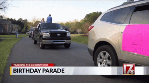 Community organizes a heartwarming birthday parade with cars and people on a truck, celebrating during the coronavirus pandemic.