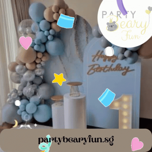 Elegant birthday party decorations featuring a balloon arch, 'Happy Birthday' sign, and light-up '1'.