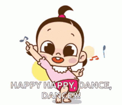 Animated cartoon girl with pigtails happily dancing, with the text 'HAPPY HAPPY, DANCE, DANCE!!!' on screen.