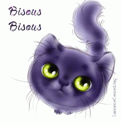 An adorable purple cat illustration with bright green eyes and the French words 'Bisous Bisous' above it.