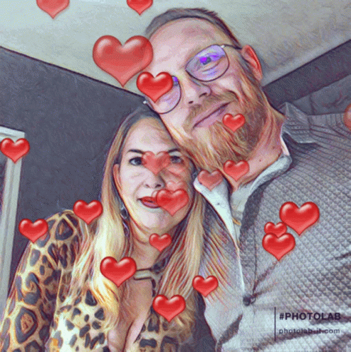 A smiling couple, a man with a beard and a woman, surrounded by red hearts and a Photolab filter.