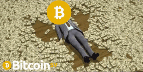 Man with Bitcoin head makes a cash angel in a pile of money, symbolizing wealth and cryptocurrency.