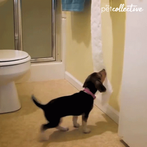 A playful puppy pulls toilet paper off the roll and plays with it on the bathroom floor, featured by The Pet Collective.