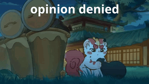 A cute Bixie fabulous beast cartoon next to trash cans, with the text 'opinion denied' displayed.