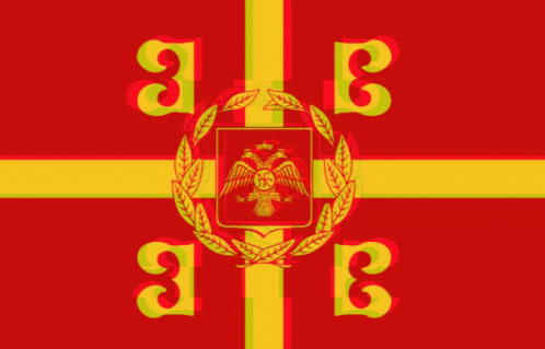 Flag of the Byzantine Empire, featuring a double-headed eagle and four beta symbols.