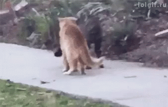 Two cats, one ginger and one black, engage in a playful BJJ-style wrestling match on a sidewalk.
