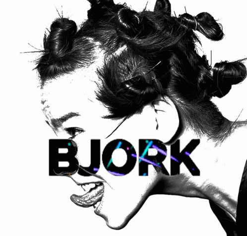 Iconic black and white portrait of Björk with her distinctive hairstyle and dynamic text overlay.