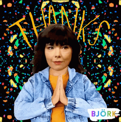 Iconic singer Björk expresses gratitude with hands clasped, set against a vibrant, colorful background.