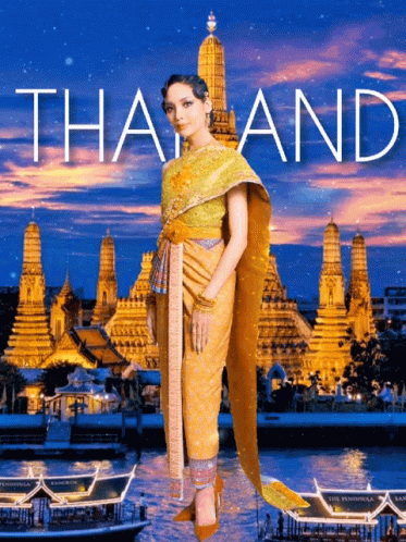 A woman in a beautiful traditional Thai dress poses gracefully in front of Wat Arun in Bangkok, Thailand.