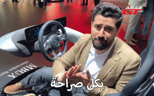 A man in a Mercedes-Benz MBUX car explains features honestly, with the ARABGT.COM logo visible.