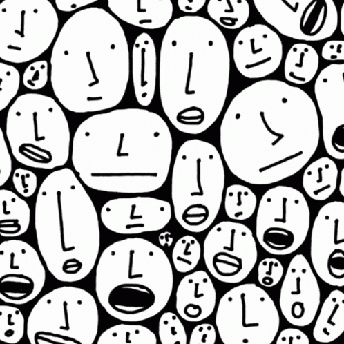 A detailed black and white drawing featuring multiple stylized faces with the letter 'L' prominently displayed in the center.