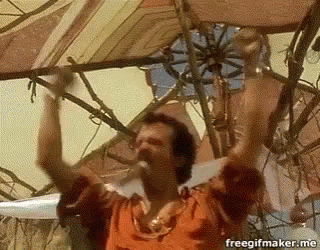 Dadan from Black Cat White Cat celebrates with arms raised under a canopy.