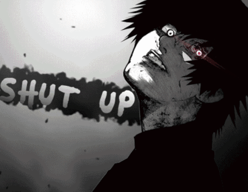 Black Reaper Ren in a striking black and white anime style, with the text 'SHUT UP' appearing next to him.