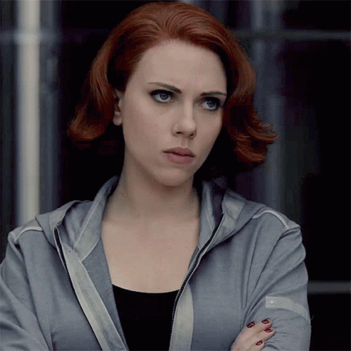 Black Widow (Scarlett Johansson) with red hair, wearing a grey jacket, looking intently.