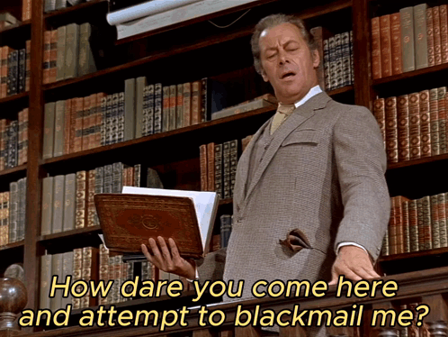 Henry Higgins, played by Rex Harrison, confronts someone attempting to blackmail him, exclaiming 'How dare you come here and attempt to blackmail me!'
