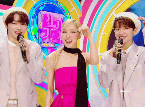Rosé from Blackpink performing her solo song 'On The Ground' on stage, wearing a vibrant pink and black dress.