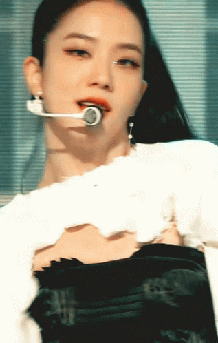 Blackpink's Jisoo smiles brightly during a captivating stage performance, wearing a white top and headset microphone.