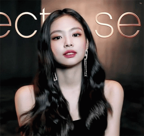 Blackpink's Jennie Kim, also known as Bp Jennie, poses elegantly with long black hair and statement earrings in front of an 'Eclipse' sign.