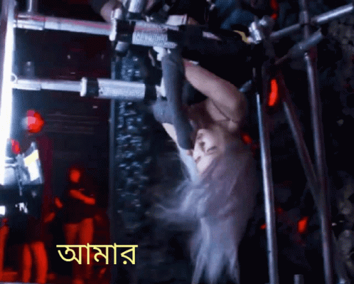 Blackpink's Rosé hanging upside down with Bengali text "My head spins..." overlaid.