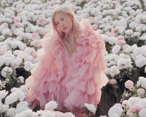 Blackpink Rosé, also known as Park Chaeyoung, in a stunning pink ruffled dress amidst a field of white flowers.
