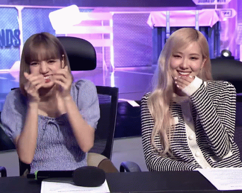 Blackpink's Lisa gives thumbs up and heart gesture, while Rosé smiles and covers her mouth.