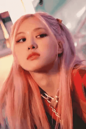 Blackpink's Rosé with vibrant pink hair, wearing a red top and a chain necklace, looking directly at the camera.