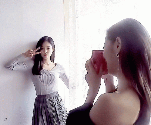 Blackpink's Jennie poses with a V-sign as Jisoo takes her picture during a photo shoot.