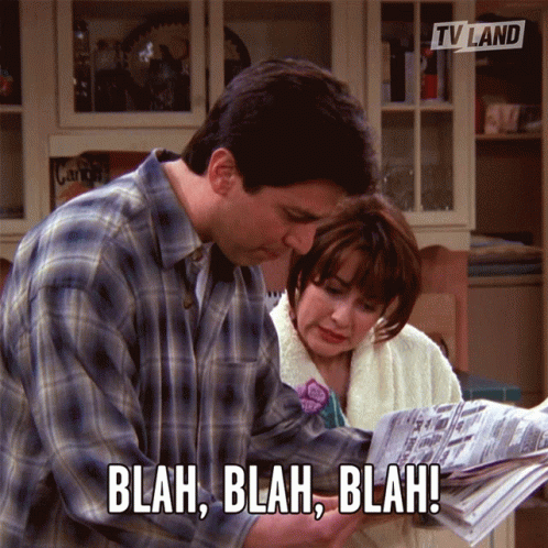 Ray Barone (Ray Romano) speaks while Debra Barone (Patricia Heaton) looks on, with the caption 'Blah, Blah, Blah!'