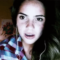 Blaire Lily from Unfriended, played by Shelley Hennig, stares intently at the camera, blinking and wearing headphones.