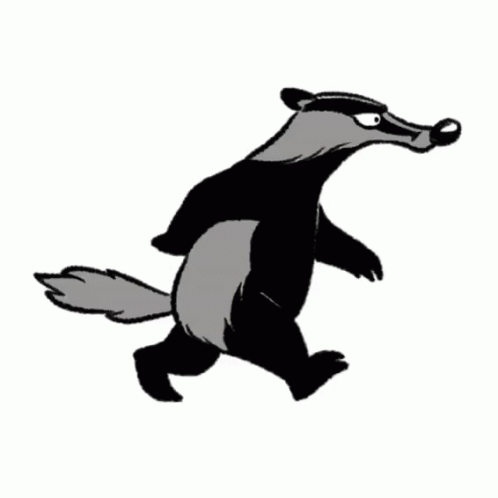 A black and white cartoon badger walking with a determined expression.