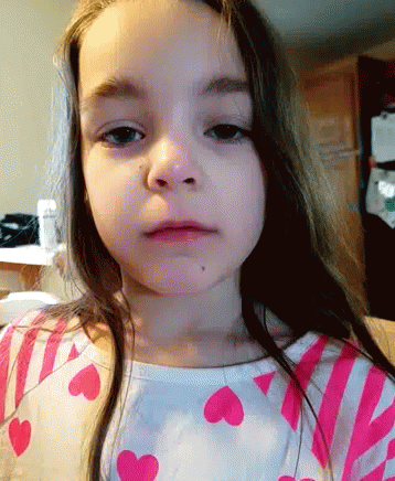 A young girl with long brown hair and blue eyes looks directly at the camera with a blank stare.
