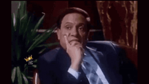 An older man in a suit and tie, making a thoughtful gesture with the Arabic caption 'بلاوي' (Troubles).