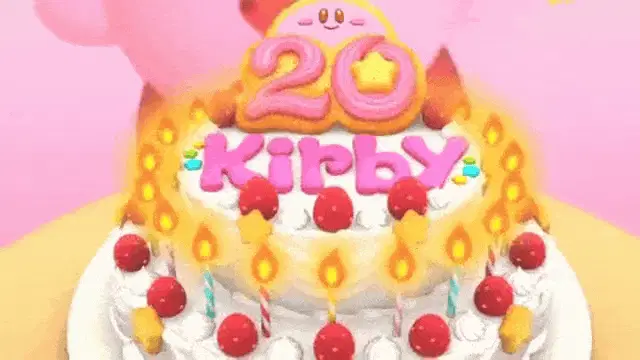 loading【星のカービィ】20周年記念のケーキに喜ぶカービィのGIF画像
