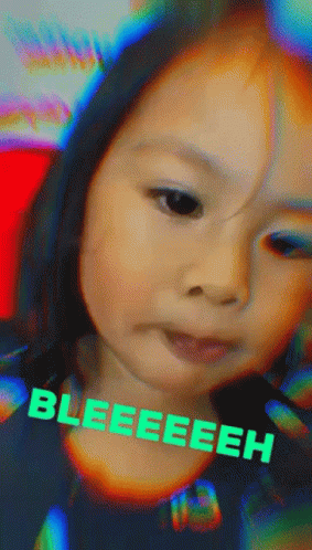 A cute little girl makes a funny face, sticking her tongue out with the word 'BLEEEEEH' on screen.