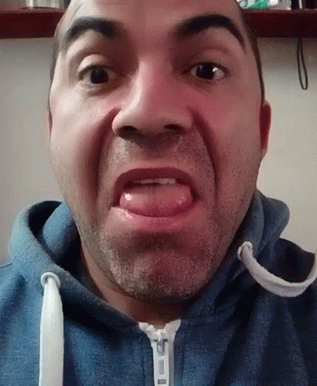 A man in a blue hoodie makes a 'bleh' face, sticking out his tongue in a playful selfie video.