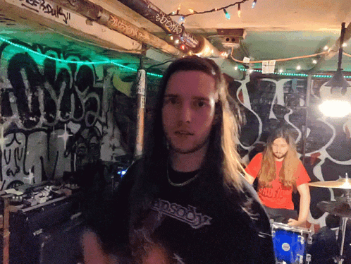 a man with long hair is wearing a shirt that says ' madson ' on it