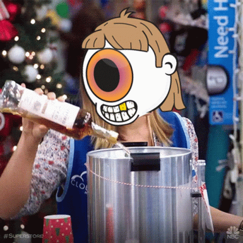 A woman with a cartoon cyclops face and gold teeth pours alcohol into a pot, likely making Hunch Punch.