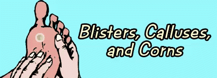 Cartoon illustration of a foot showing common skin conditions like blisters, calluses, and corns.