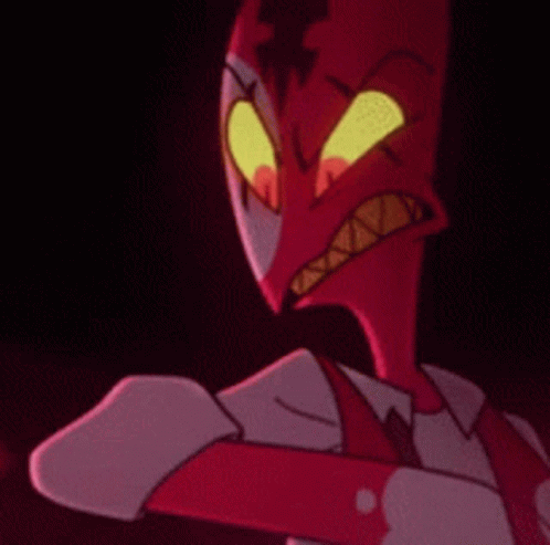 Blitzo from Helluva Boss, a red demon character, shows an intense, angry expression with glowing yellow eyes and sharp teeth.