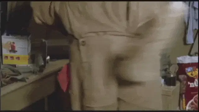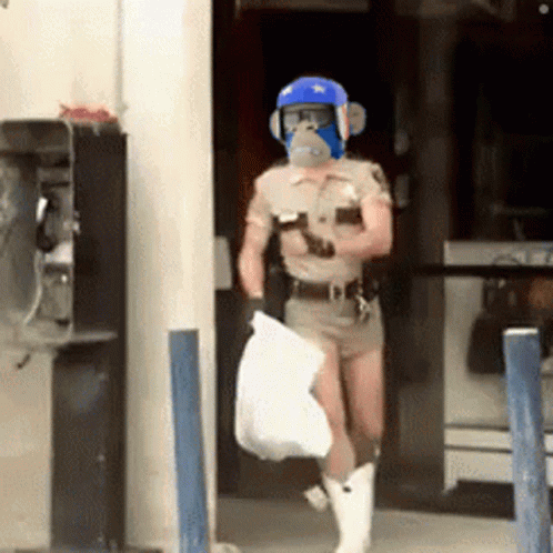 A Blockapelads ape officer, wearing a helmet and mask, runs with a white bag in a peculiar manner.