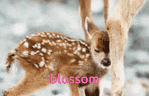 A cute baby fawn with white spots stands in a snowy environment, with the word 'blossom' in pink text.