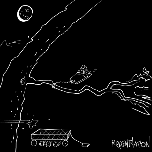 A black and white cartoon shows a rodent in a bed being blown away by a severe wind storm under a full moon.