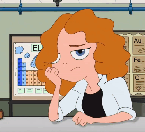 Melissa Chase looks bored, resting her chin and puffing out her cheeks in front of a periodic table.