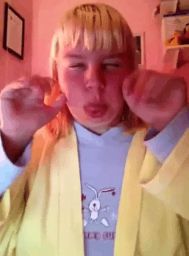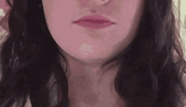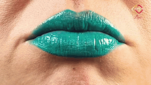 Close-up of a woman's lips with shiny green lipstick, blowing raspberries and making horse lips.