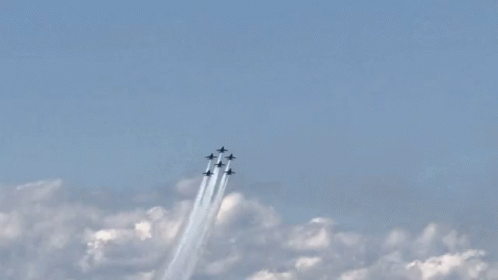The Blue Angels Navy Jets perform a stunning airshow formation with smoke trails against a blue sky.