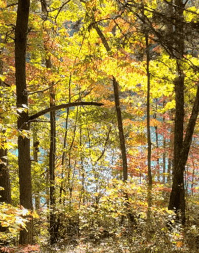 Vibrant autumn forest in Blue Ridge, North Georgia, with sparkling lake water visible through colorful fall leaves.