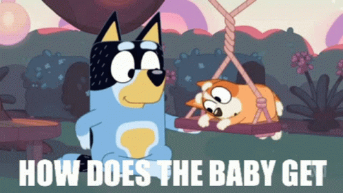 Bluey's dad Bandit and Bingo discuss how babies get in bellies, leading to an awkward moment.