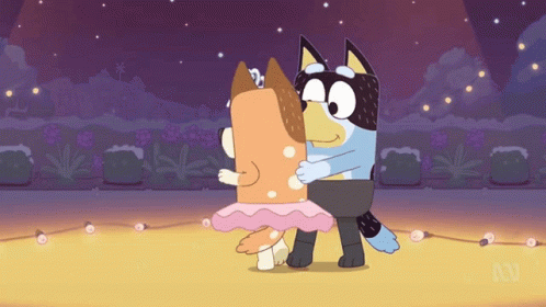 Bluey and Bandit from the show Bluey dancing ballet, with Bluey wearing a pink tutu and tiara, while Bandit guides her.