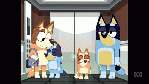 Bluey, Bingo, Bandit, and Chilli from the Bluey series are seen standing together in an elevator.
