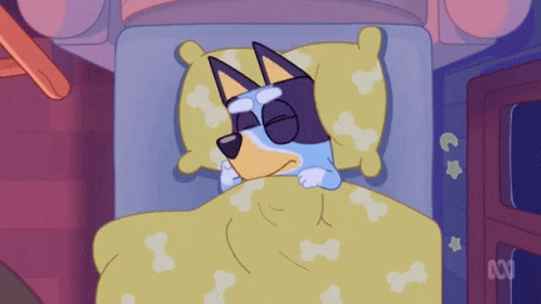 Bluey the cartoon dog is wide awake in bed, struggling with insomnia and exclaiming, 'I CAN'T FALL ASLEEP!'